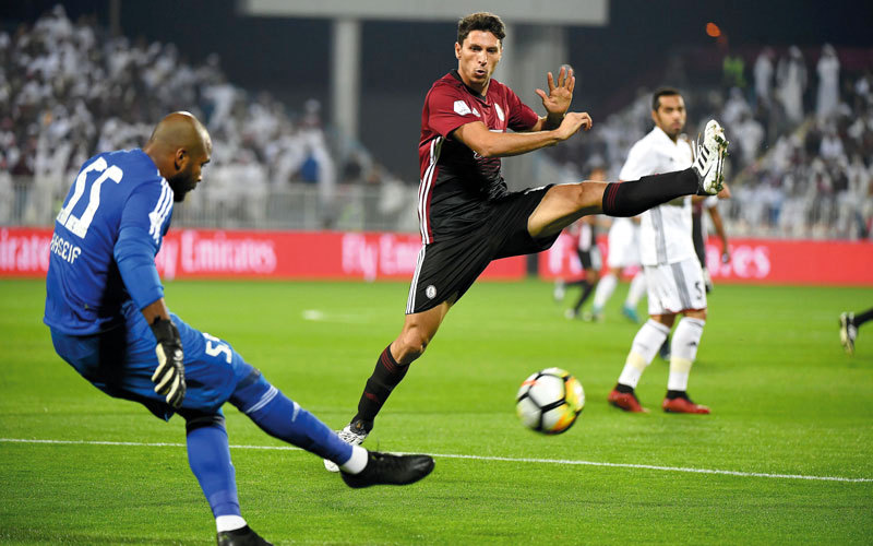 علي خصيف يسدد الكرة قبل مهاجم الوحدة تيغالي. تصوير: إريك أرازاس
