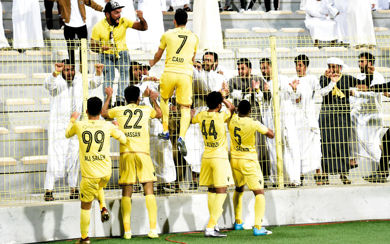 لاعبو الوصل يحتفلون مع أنصار «الإمبراطور» بعد الفوز على الشارقة. تصوير: أسامة أبوغانم