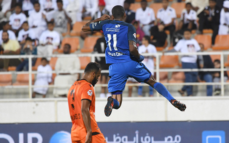 مارسيلو يطير فرحاً بعد تسجيله هدف الفوز للنصر على عجمان. تصوير: أسامة أبوغانم