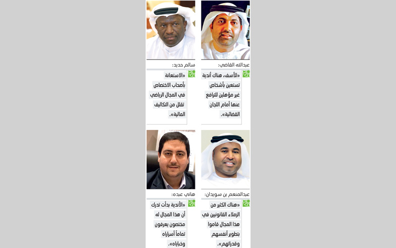 وقالوا لـ«الإمارات اليوم»: «شهدت الفترة الأخيرة تنافساً كبيراً بين الأندية للاستعانة بخبرات قانونية لديها خبرة كبيرة في هذا المجال للترافع عنها، وتمثيلها أمام اللجان القضائية في اتحاد الكرة لحفظ حقوقها، بجانب أيضاً أن هناك لاعبين محليين وأجانب يستعينون أيضاً بمحامين معروفين في هذا المجال».