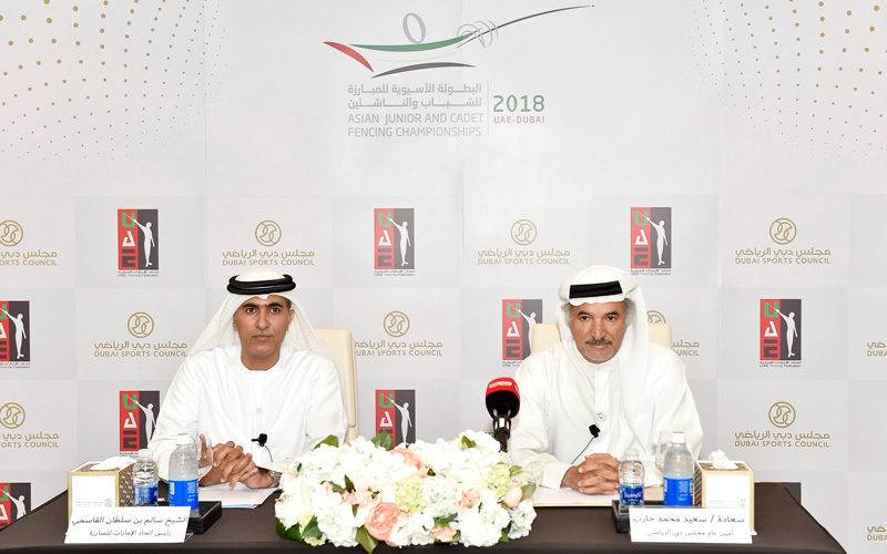 منتخب المبارزة سيشارك في منافسات البطولة الآسيوية للشباب والناشئين بـ 18 لاعباً ولاعبة سالم القاسمي: «البطولة الآسيوية ستحظى بمشاركة 800 مبارز وإداري ومدرب». سعيد حارب: «تنظيم البطولة في مجمع حمدان الرياضي سيزيد من روعة المنافسات». |
