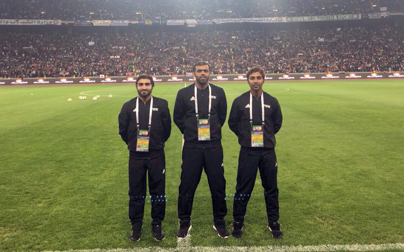 عمار الجنيبي يتوسط طاقم تحكيم المباراة. من المصدر