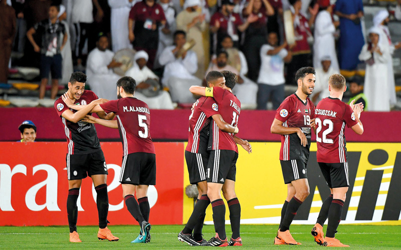 فرحة لاعبي الوحدة بالفوز الثمين على ذوب آهن الإيراني. تصوير: إريك أرازاس