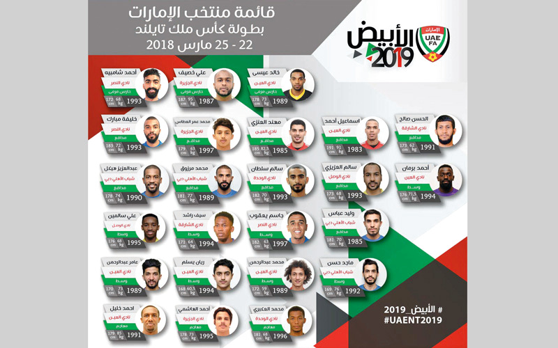 اعتمدت لجنة المنتخبات والشؤون الفنية باتحاد الإمارات لكرة القدم خلال اجتماعها الذي عُقد بمقر الاتحاد في أبوظبي، أمس، قائمة المنتخب الجديدة المكونة من 24 لاعباً، اختارهم مدرب المنتخب، الإيطالي ألبيرتو زاكيروني، تحضيراً للمشاركة في بطولة كأس ملك تايلاند الدولية الودية التي ستقام في بانكوك من 22 إلى 25 الجاري، بمشاركة الإمارات، وتايلاند (البلد المستضيف)، وسلوفاكيا والغابون، ويدشن الأبيض مبارياته فيها بلقاء سلوفاكيا.