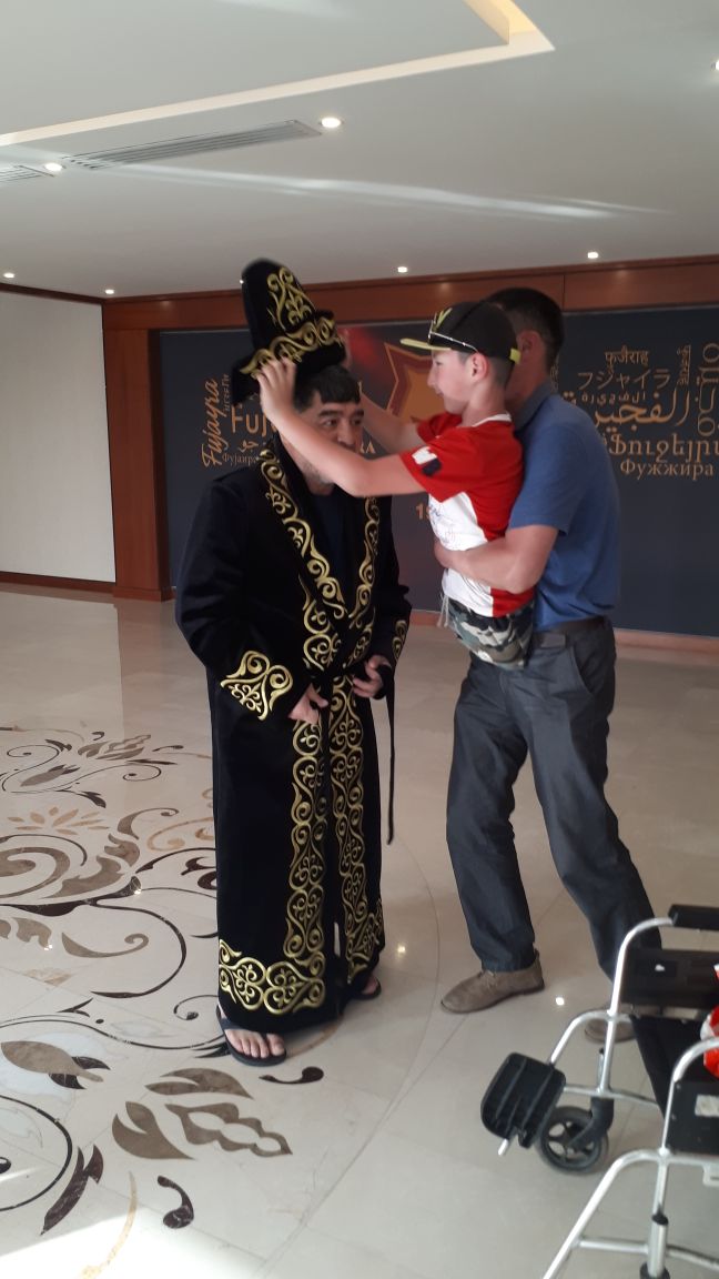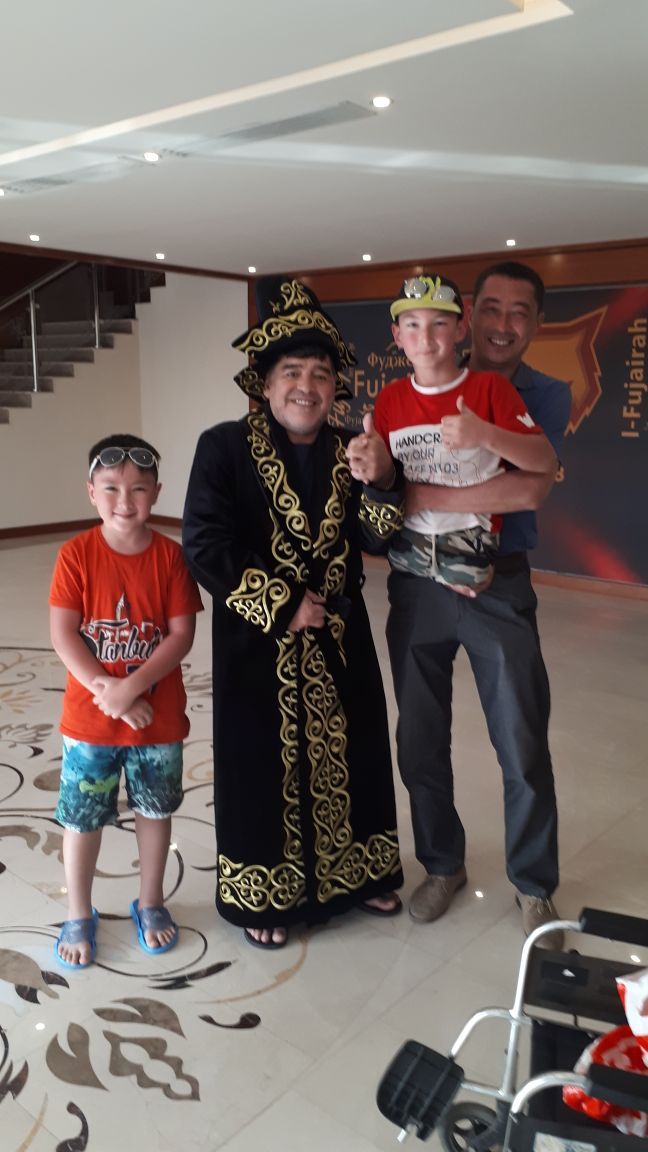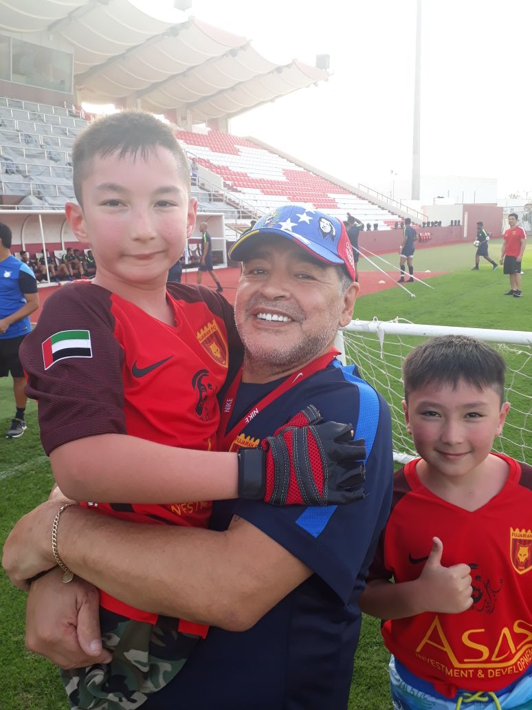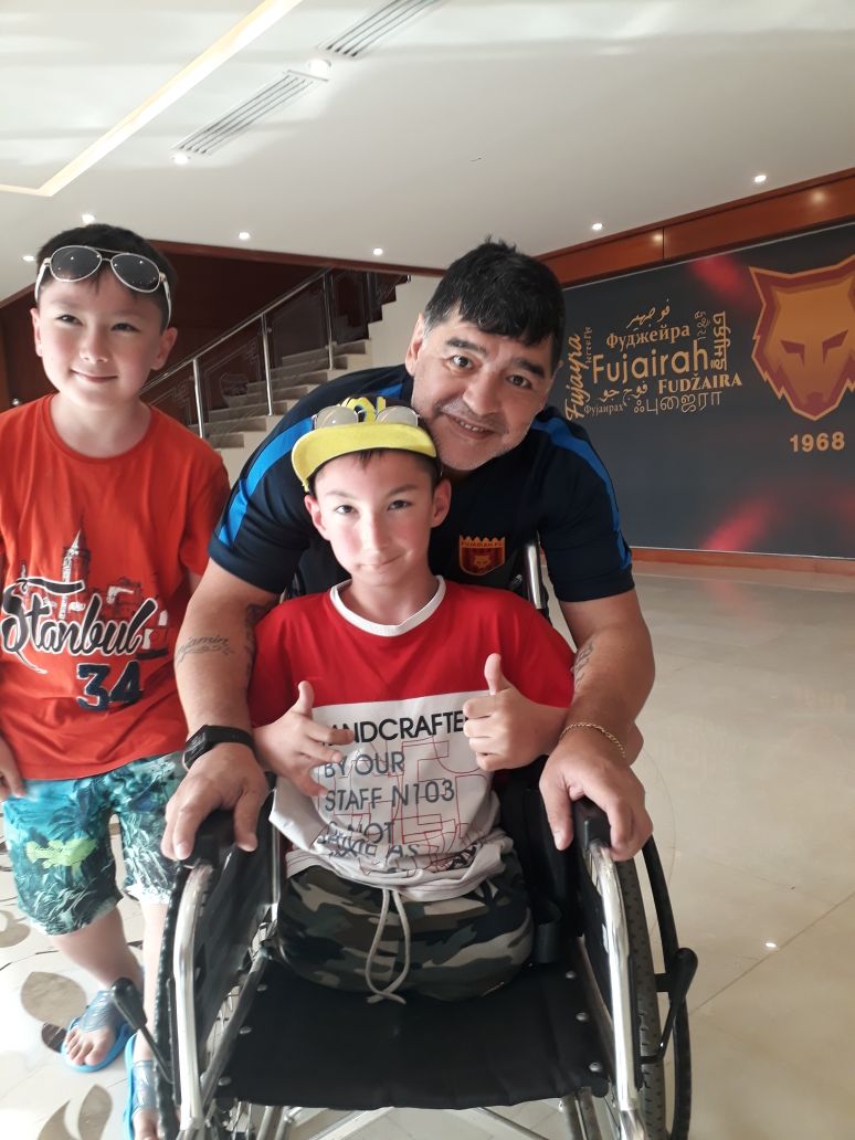 وصف الكازاخستاني ازمت والد الطفل علي من وهو من اصحاب الهمم زيارته لدولة الامارات العربية المتحدة وتنفيذ رغبة ولده بزيارة المدير الفني لنادي الفجيرة الاسطورة الارجنتينية ديغو مارادونا بالانسانية والتاريخية لعائلته لكونها ساهمت برفع الروح المعنوية لولده والذي يمضي حياته بدون اطراف، معبرا عن سعادته الكبيرة لاستقبال الاماراتيين له والتشجيع والحفاوة والضيافة الكبيرة التي لقيها لدى زيارته لنادي الفجيرة، وظهر الاسطورة مارادونا سعيدا للغاية وهو يلاعب الطفل المبتور الساقين.