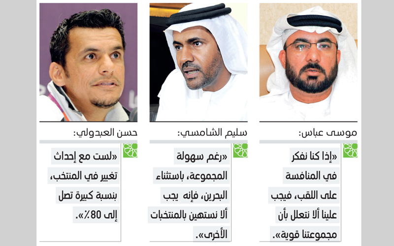 بدوره، اعتبر مساعد مدرب المنتخب السابق، حسن العبدولي، أن المجموعة متوازنة وفي متناول الأبيض، وقال: وصف مجموعة المنتخب بـ«القوية» يقلل القيمة الفنية للمنتخب، كونه يعد الأعلى مستوى من منتخبات مجموعته، والمرحلة المقبلة تتطلب من زاكيروني العمل على تثبيت طريقة اللعب التي سيتعمدها في البطولة الآسيوية، وكذلك الاستقرار على التشكيلة الأساسية. وتابع العبدولي: لست مع إحداث تغيير في المنتخب بنسبة كبيرة تصل إلى 80%، وإنما الاستقرار على الأسماء القديمة، والاستعانة بعناصر برزت في الفترة الماضية.