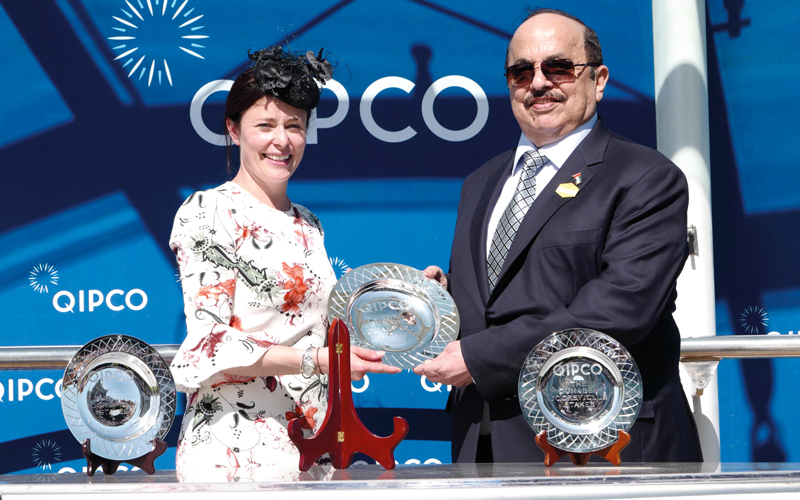 وتسلم جائزة الفوز بالشوط نيابة عن المالك الشيخ جمعة بن دلموك آل مكتوم، وسط تصفيق الجماهير لهذا الانتصار.