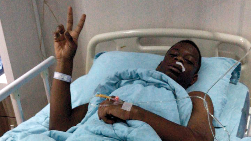 عبدالله ربيع بعد نقله إلى المستشفى بسبب سقوط أسنانه في الملعب. من المصدر