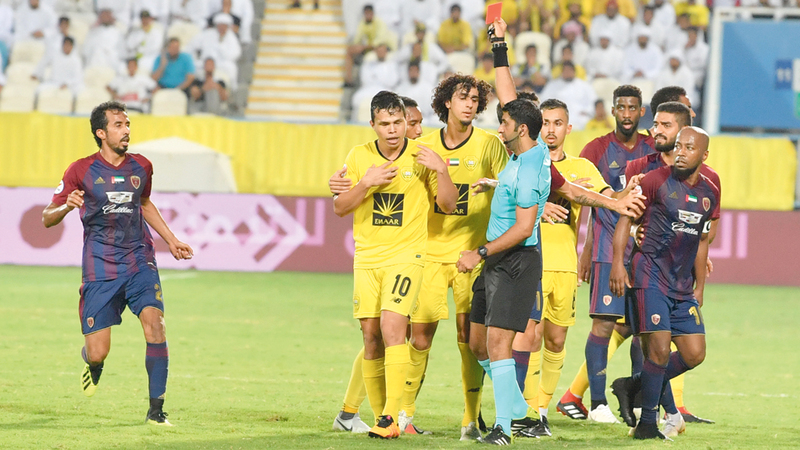 الحكم الدولي محمد عبدالله حسن يشهر البطاقة الحمراء في وجه لاعب الوصل ليما. تصوير: نجيب محمد