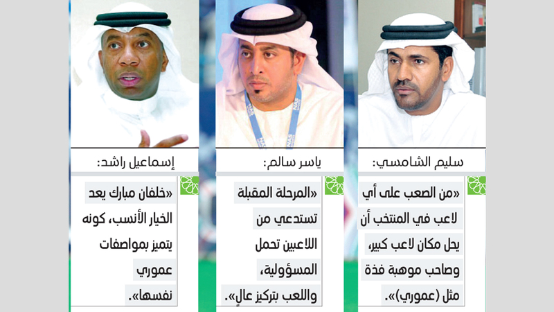 بدوره، شدد عضو مجلس إدارة اتحاد كرة القدم الأسبق، الدكتور سليم الشامسي، أنه «من الصعب على أي لاعب في المنتخب أن يحل محل لاعب كبير وصاحب موهبة فذة مثل (عموري)، لذلك فإن الخيار الأنسب أمام المدرب هو تغيير طريقة اللعب، والاعتماد على الأسلوب الجماعي، وتقليل الفراغ الكبير الذي يتركه غياب (عموري) كصانع ألعاب مميز، بجانب قدرته العالية على تسجيل الأهداف وصنعها في الوقت نفسه»، معتبراً أن هناك خياراً آخر أمام مدرب المنتخب، هو إيجاد لاعب بديل بمواصفات تكون قريبة من «عموري»، وتجهيزه من الآن للقيام بمهمة صانع الألعاب، مشيراً إلى أن هذه المواصفات تتوافر في اللاعب خلفان مبارك، الذي يعد من اللاعبين الذين ظهروا بمستوى فني متطور في الفترة الماضية، لافتاً في الوقت ذاته إلى أن لكل لاعب مواصفات تختلف عن الآخر.