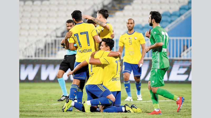 لاعبو الظفرة يحتفلون بالفوز على دبا الحصن. تصوير: إريك أرازاس