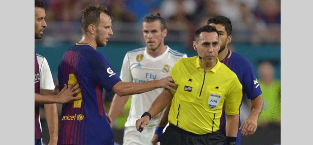 لكن الحكم الأميركي أثار جدلا في مباراة الكلاسيكو الودية التي جمعت بين ريال مدريد وبرشونة في مدينة ميامي الأميركية منتصف العام الماضي وانتهت بثلاثة أهداف مقابل هدفين، إذ إن لاعب وسط البارسا الكرواتي إيفان راكيتيتش اتهم الحكم بسبه 3 مرات.