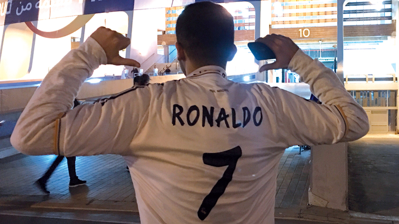 مشجع مدريدي يرتدي قميص الريال باسم رونالدو أمام استاد مدينة زايد. الإمارات اليوم