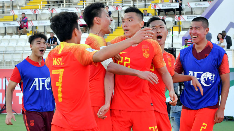 المنتخب الصيني يحتفل بالفوز على قيرغزستان. تصوير: نجيب محمد