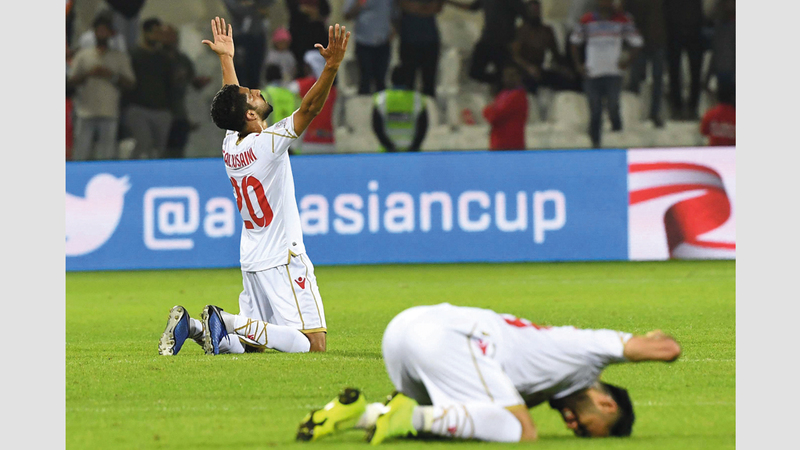 لاعبو البحرين يبتهجون ببطاقة التأهل في الدقيقة 89. تصوير: أسامة أبوغانم