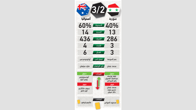 فشل المنتخب السوري في رد دين إقصائه من الملحق الآسيوي لكأس العالم روسيا 2018 على يد الأستراليين، ليصبح أمس ثاني المودعين لبطولة كأس أمم آسيا، ومرة أخرى على يد «الكانغارو»، بعد الخسارة منه 3-2، في المباراة التي أقيمت على استاد خليفة بن زايد بالعين، في ختام الدور الأول للمجموعة الثانية، التي شهدت أيضاً تعادل فلسطين سلباً مع الأردن، ليتذيل منتخب سورية المجموعة بنقطة يتيمة، بينما تصدر الأردن بسبع نقاط، وأستراليا ثانية بست، وفلسطين ثالثة بنقطتين.