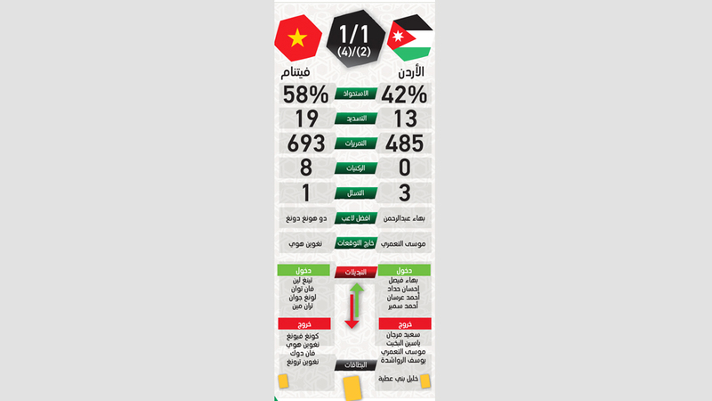 وقدم المنتخب الأردني أداءً قوياً في الشوط الأول، وتقدم بالهدف الأول عن طريق بهاء عبدالرحمن، ولم يستغل «النشامى» الدعم القوي من الجمهور الأردني الذي حضر بقوة في استاد آل مكتوم، حيث شكل غالبية الجمهور الذي بلغ 14 ألفاً و205 متفرجين، بينما تفوق منتخب فيتنام في الشوط الثاني، وأحرز كونغ فيونغ نغين هدف التعادل، قبل أن يتراجع أداء الفريقين، ويتفوق «التنين الذهبي» في ركلات الترجيح.