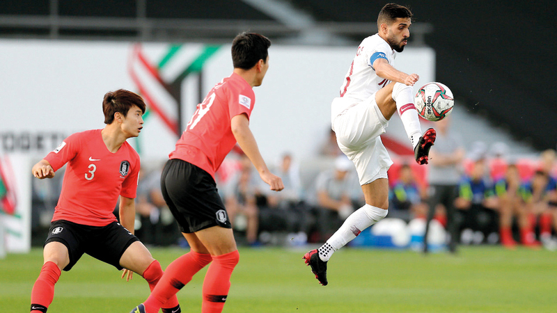 القطري حيدوس يروض الكرة بين لاعبي كوريا الجنوبية. تصوير: نجيب محمد