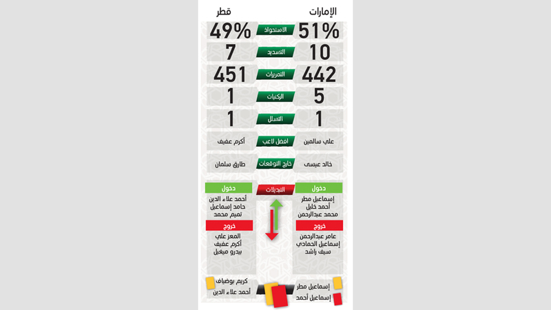 وفي الدقيقة 22، قاد أكرم عفيف هجمة مرتدة، ومرر الكرة إلى بوعلام خوخي الذي سدد الكرة على يمين خالد عيسى، محرزاً الهدف الأول لمنتخب قطر، ونشط بعدها المنتخب الوطني، إذ تقدم وليد عباس للقيام بأدوار هجومية، ولعب كرة عرضية وصلت إلى إسماعيل الحمادي الذي حول الكرة برأسه في يد الحارس (27)، وأتبعها علي مبخوت بفرصة أخرى من ركلة ركنية لعبها عامر عبدالرحمن، وحولها مبخوت برأسه بجوار القائم (30)، بينما تكررت أخطاء دفاع «الأبيض» في مواجهة الهجمات المرتدة، بعدما وصلت الكرة إلى المعز علي، الذي راوغ الدفاع وسدد كرة ارتدت من القائم ودخلت المرمى، محرزاً الهدف الثاني.