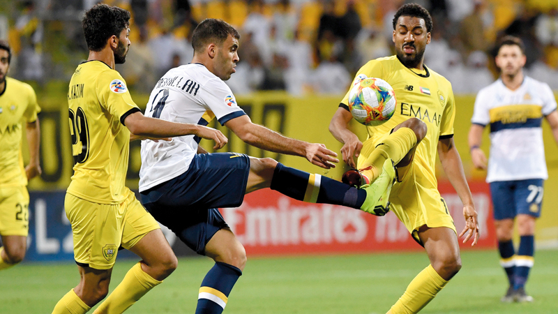 خميس إسماعيل يقطع الكرة من المغربي عبدالرزاق حمدالله أثناء مباراة الوصل والنصر السعودي. تصوير: أسامة أبوغانم