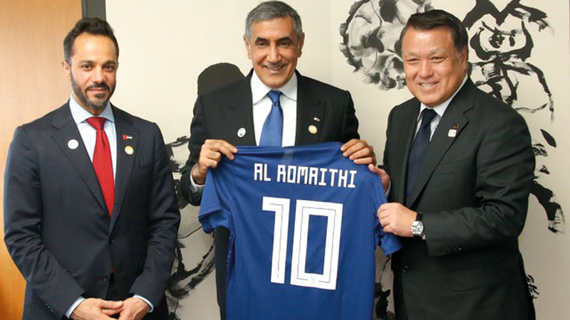 الرميثي يتسلم قميص المنتخب الياباني من تاشيما بحضور العامري. من المصدر