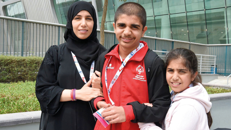 عبدالعزيز الحمادي برفقة والدته وشقيقته لدى مشاركته في الأولمبياد الخاص «أبوظبي 2019». تصوير: أسامة أبوغانم
