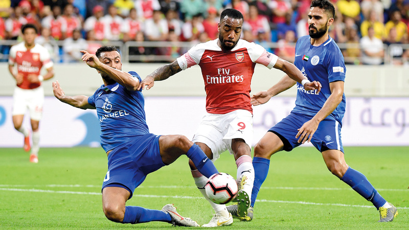نجم أرسنال لاكازيت تعرض لرقابة لصيقة من لاعبي النصر. تصوير: باتريك كاستيلو