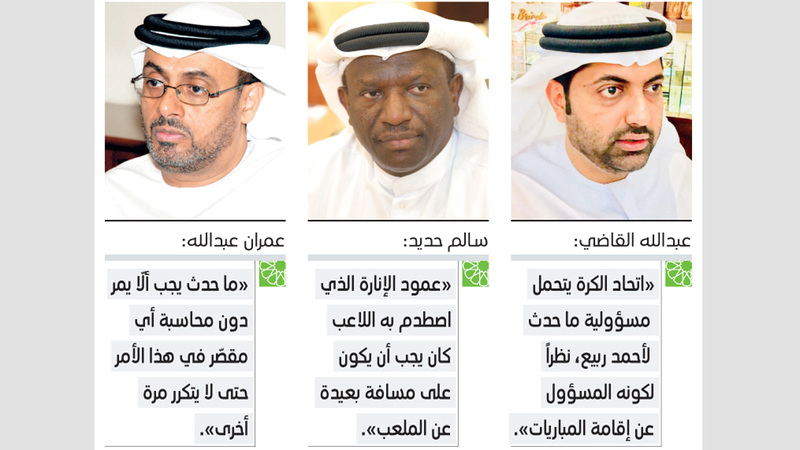 وأشار عبدالله القاضي الى أن «اتحاد الكرة هو من يتحمل مسؤولية ما حدث للاعب أحمد ربيع، نظراً لكونه المسؤول عن إقامة أي نشاط رياضي يتعلق بكرة القدم داخل الدولة».