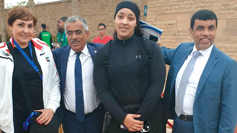 وفد ألعاب القوى يحتفي بفوز فاطمة الحوسني. من المصدر