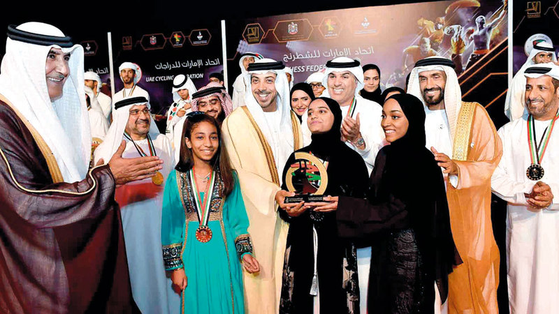 منصور بن زايد خلال تكريم أصحاب الإنجازات الرياضية لعام 2018 بحضور نهيان بن زايد. أرشيفية