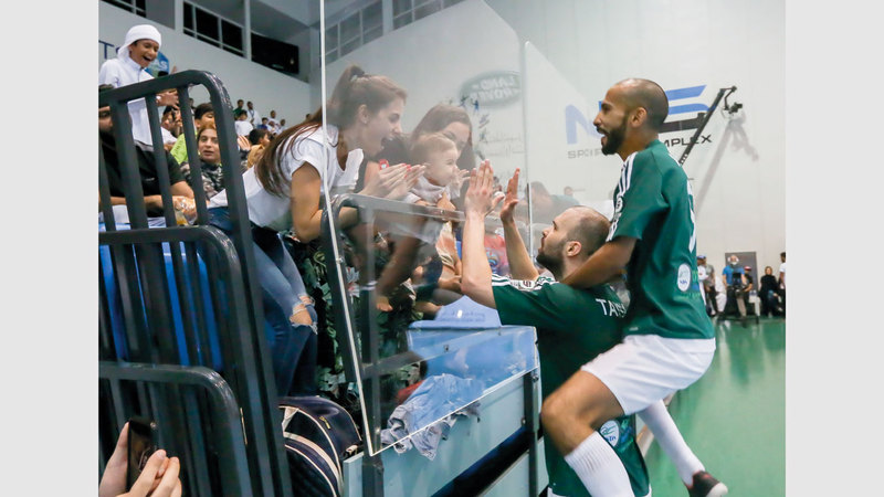 لاعب فريق «المدرسة السعودية للقيادة»، البرازيلي تينان دا سيلفا، يحتفل مع أسرته ونجله الصغير بالفوز على «الطاهر» والتأهل لنهائي مسابقة كرة القدم للصالات، ضمن دورة ند الشبا الرمضانية التي تجري فعالياتها حالياً في دبي.