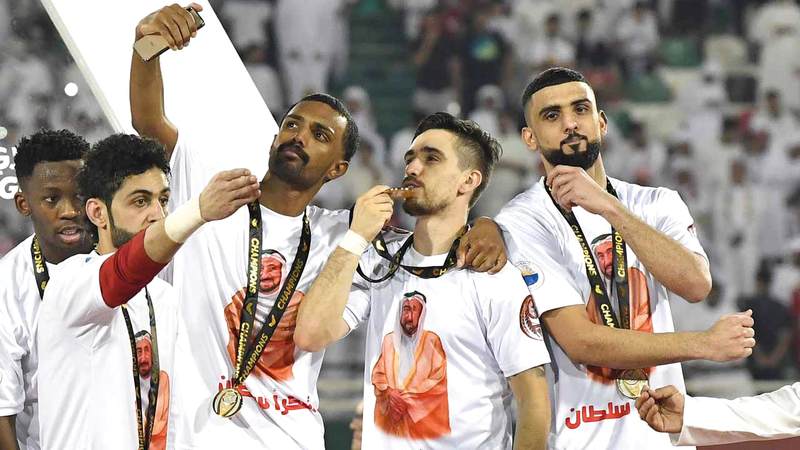 لاعبو الشارقة يلتقطون «سيلفي» بعد الفوز بالدوري. تصوير: أسامة أبوغانم