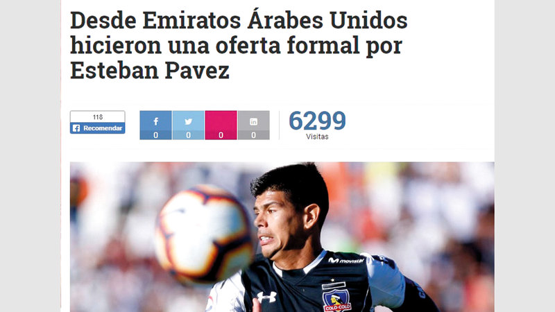 وأوضحت صحيفة «بيو بيو تشيلي» أن أحد أندية دوري الخليج العربي، عرض 600 ألف دولار على نادي كولو كولو، للتعاقد مع إستيبان بافيز لمدة موسم واحد على سبيل الإعارة، لافتة إلى وجود عروض أخرى لضم اللاعب الدولي من البرازيل والمكسيك. وأضافت: «النادي الإماراتي يستعجل حسم الصفقة قبل انتهاء بطولة كوبا أميركا التي تنطلق غداً في البرازيل، خصوصاً أن بافيز ضمن قائمة منتخب تشيلي في البطولة، وقد يرتفع سعره أو تصبح مهمة التعاقد معه صعبة».