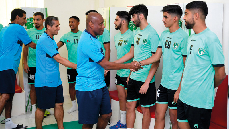 عيد باروت يصافح لاعبي فريق الإمارات في أول تدريب. من المصدر