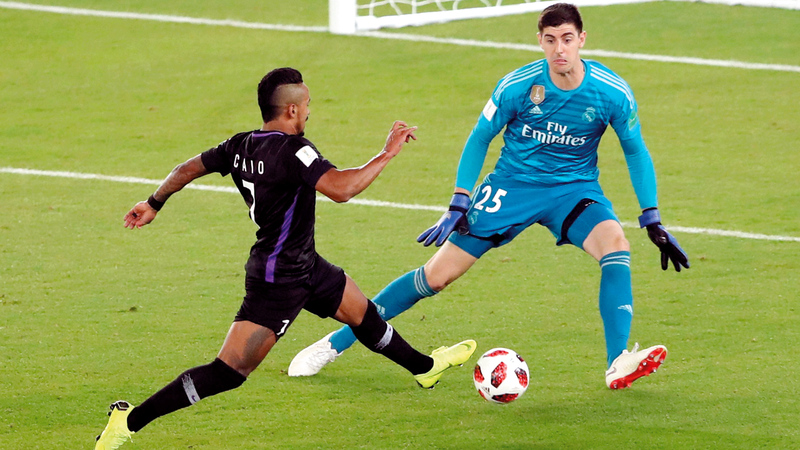 كايو يحاول تجاوز حارس ريال مدريد كورتوا خلال مونديال الأندية. أ.ف.ب