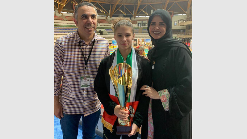 ليلى الخطيب تتوسّط الوهيبي ومريم الشامسي بكأس المركز الثالث. من المصدر