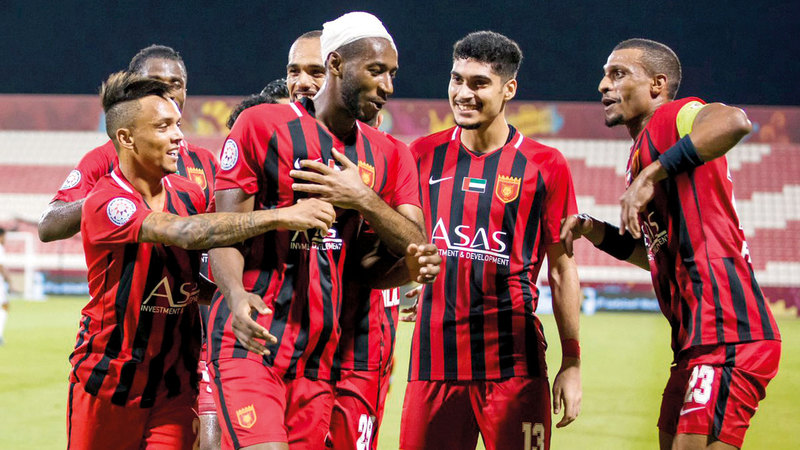 لاعبو الفجيرة يحتفلون مع زميلهم عبدالله الجنيبي بعد هدف الفوز. من المصدر