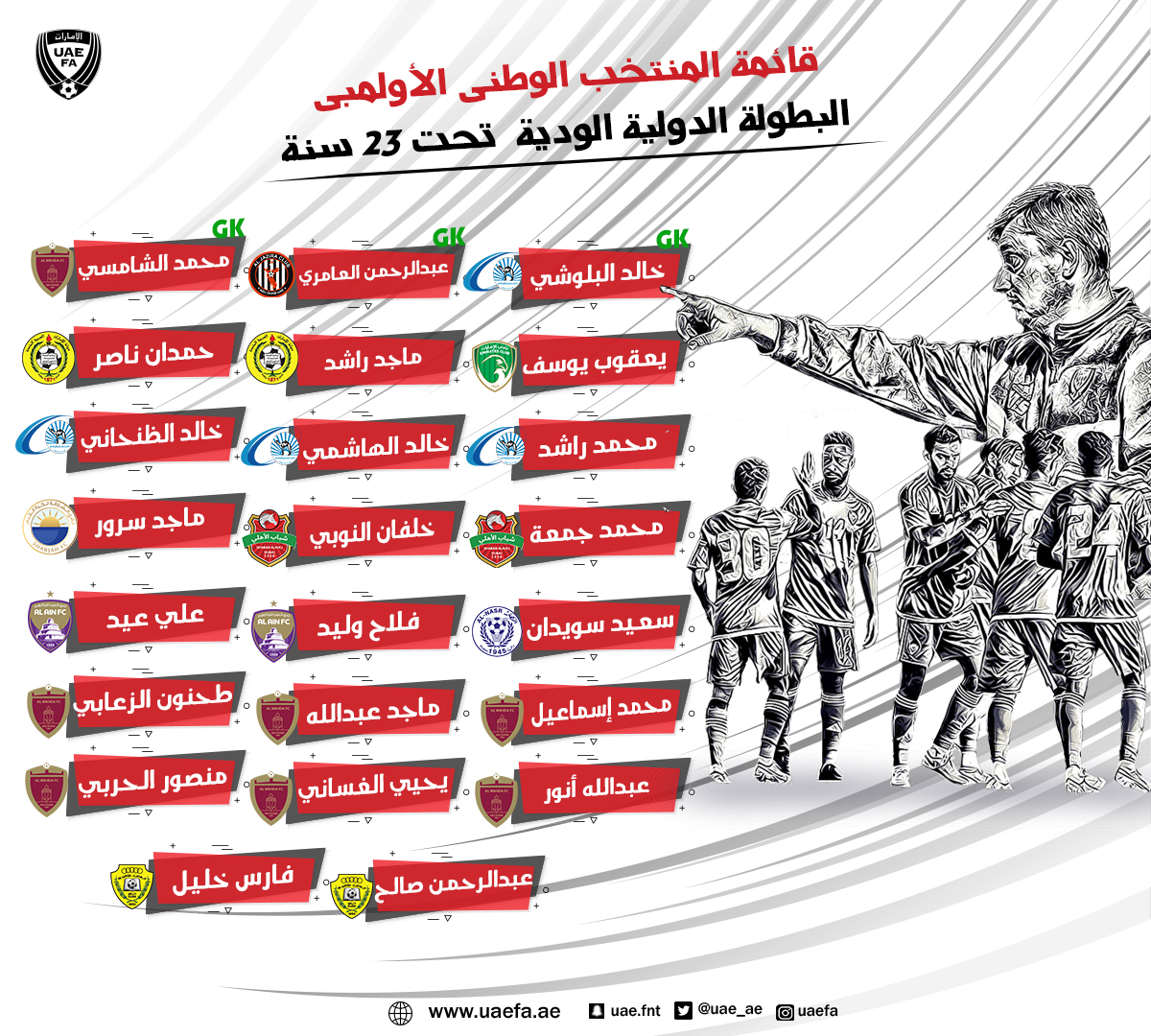وتضم القائمة 23 لاعباً، هم: حمدان البارود، ماجد المحرزي (اتحاد كلباء)، يعقوب آل علي (الإمارات)، خالد إبراهيم، خالد عبدالرحمن، خالد الهاشمي، محمد الحمادي (بني ياس)، عبدالرحمن العامري (الجزيرة)، ماجد سرور (الشارقة)، خلفان النوبي، محمد جمعة (شباب الأهلي)، علي عيد غميل، فلاح الجنيبي (العين)، سعيد علي (النصر)، طحنون الزعابي، ماجد عبدالله، محمد إسماعيل، محمد الشامسي، منصور الحربي، يحيى علي، عبدالله أنور (الوحدة)، فارس خليل، عبدالرحمن صالح (الوصل).