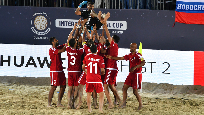 فرحة كبيرة للاعبي منتخب الكرة الشاطئية، أمس، بعد الفوز على اليابان بركلات الترجيح 2-1، والتأهل إلى نصف نهائي كأس القارات المقامة في دبي حالياً.. وفي الصورة اللاعبون يحتفون بالحارس، محمد الجسمي، الذي تصدى لركلتين وأسهم بشكل كبير في التأهل.