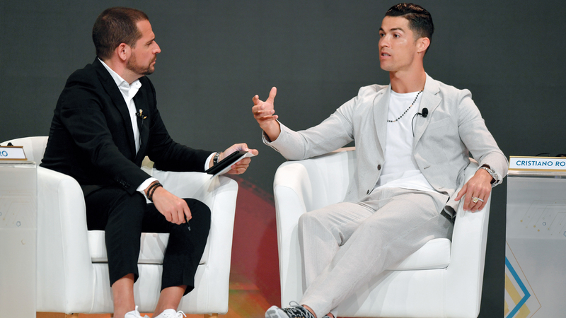 شدّت الجلسة الرئيسة لمؤتمر دبي الدولي الأنظار أمس، كون المتحدث فيها كان النجم العالمي، الفائز بخمس كرات ذهبية، البرتغالي كريستيانو رونالدو، وجاءت تحت عنوان «مواجهة التحديات على طريقة كريستيانو رونالدو»، والتي أدارها المحلل الرياضي في قناة «تي في آن» البرتغالي روي بيدرو، حيث تطرق خلالها إلى أبرز التحديات التي وضعها لنفسه بعد كرة القدم، ومنها أن «يكون نجماً سينمائياً»، بجانب «إكمال دراسته».