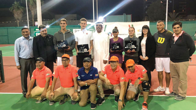 توج الامين العام لاتحاد الإمارات للتنس ناصر المرزوقي، أول من أمس، الفائزين الاوائل في بطولة الفجيرة الدولية للشباب، التي اقيمت في ملاعب نادي النصر لينغرلاند، بعد ان تم نقلها من الفجيرة إلى دبي بسبب هطول الامطار الشديد مما تعذر اكمالها في ملاعب الفجيرة.