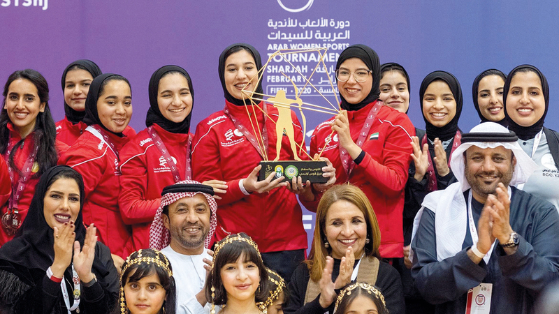 من مراسم تتويج لاعبات الشارقة بكأس مسابقة فِرَق القوس والسهم. من المصدر