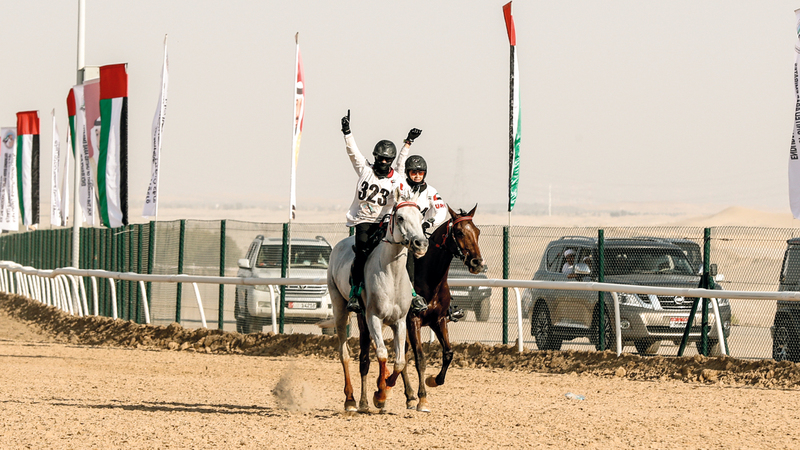 فارس وفارسة شاركوا في السباق، الذي أقيم أول من أمس، في قرية الإمارات العالمية للقدرة بالوثبة.