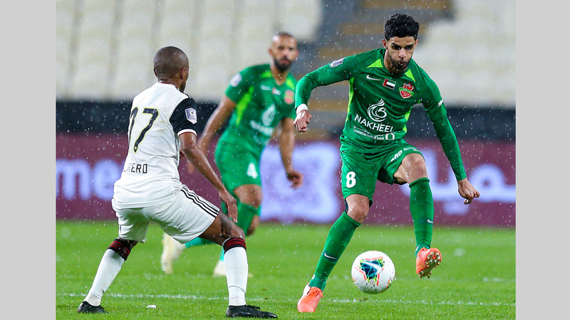 وليد حسين وسيريرو في لقاء سابق لشباب الأهلي والجزيرة. ■ الإمارات اليوم