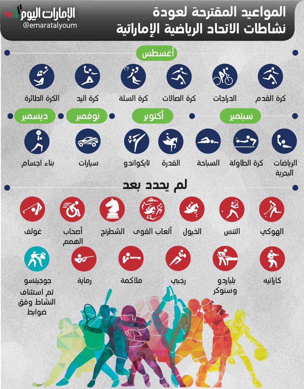 تستعد الساحة الرياضية في الإمارات لعودة النشاط الرياضي خلال المرحلة المقبلة، ولدى كل اتحاد رياضي خطة ومواعيد مقترحة لاستئناف النشاط، إذ من المتوقع ان تعود مسابقات كرة القدم والدراجات وكرة الصالات والسلة واليد والطائرة في شهر أغسطس المقبل، فيما يتوقع ان تعود مسابقات الرياضات البحرية وكرة الطاولة والسباحة في شهر سبتمبر، على ان تعود منافسات القدرة والتايكواندو في أكتوبر، وانشطة رياضة السيارات في نوفمبر، ومسابقات بناء الأجسام في ديسمبر، على ان تستكمل باقي الألعاب تباعاً خلال الفترة المقبلة.