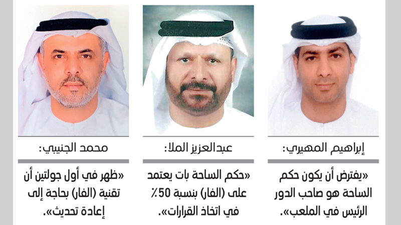 بدوره أكد الحكم السابق في كرة القدم إبراهيم المهيري، رداً على سؤال بشأن وجود مشكلات تقنية في «الفار»، أنه يفترض أن يكون حكم الساحة هو صاحب الدور الرئيس في الملعب، وألا يعتمد على تقنية الفيديو بشكل أساسي، لافتاً إلى أنه من الملاحظ أنه خلال السنتين الماضيتين تم التركيز على حكم الفيديو ونسيان حكم الساحة، مشدداً على أهمية مواصلة الحكام العمل بجدية لتلافي الأخطاء.