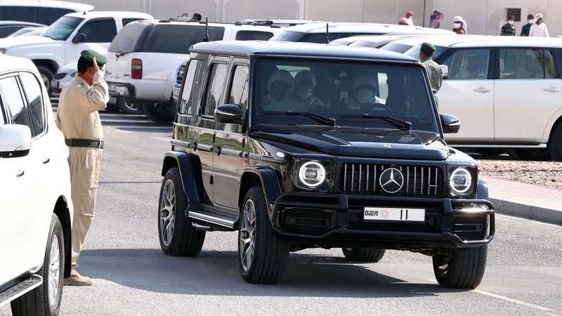 حمدان بن محمد لدى حضوره تحديات رموز مهرجان «خطاك الشر» بميدان المرموم لسباقات الهجن. من المصدر