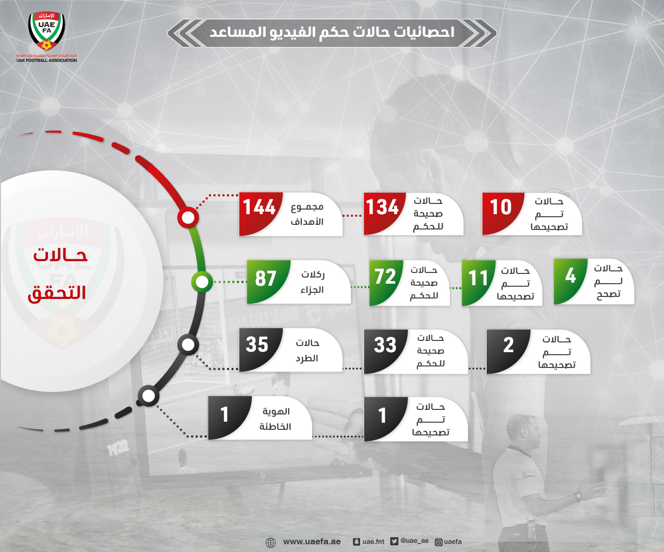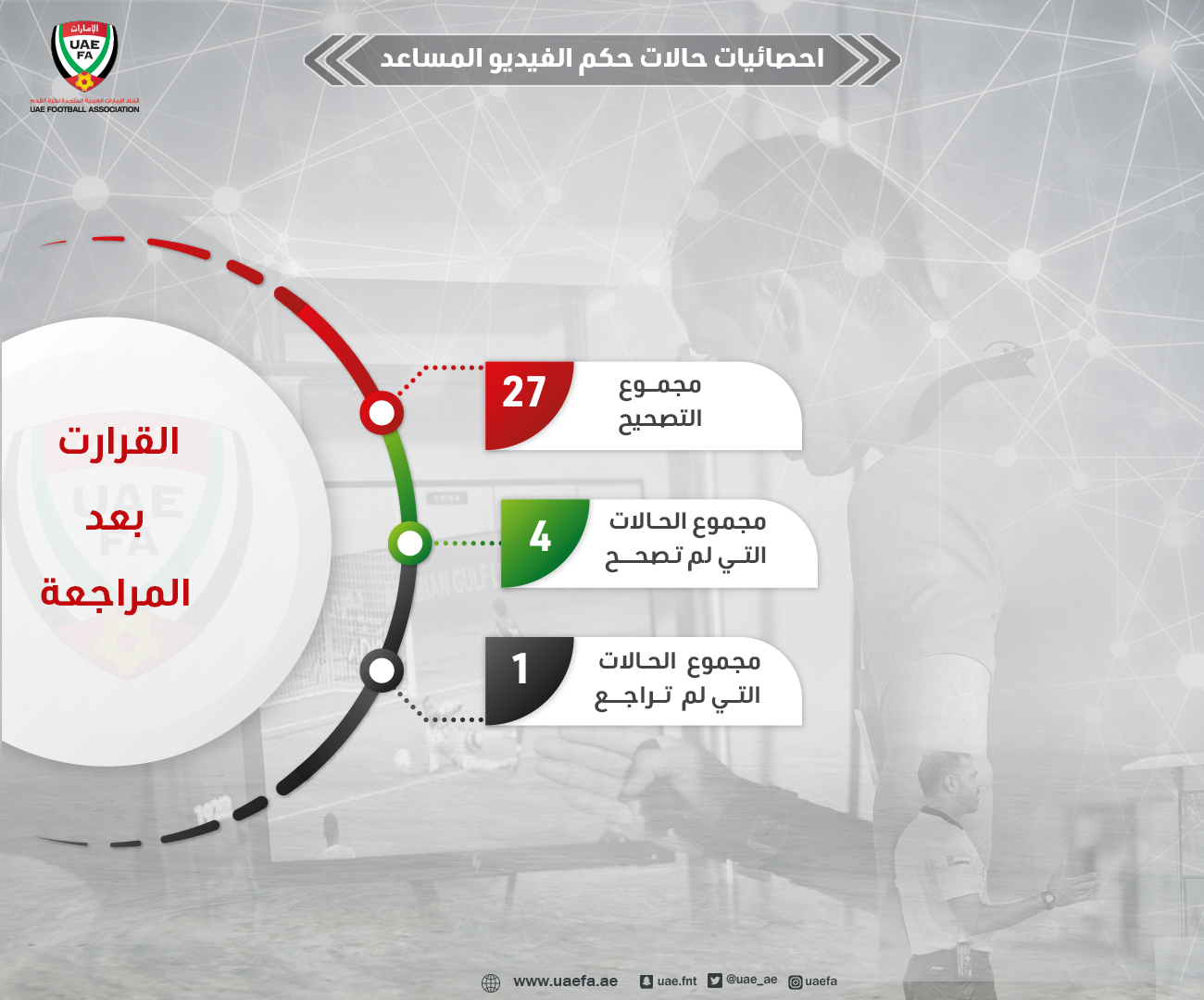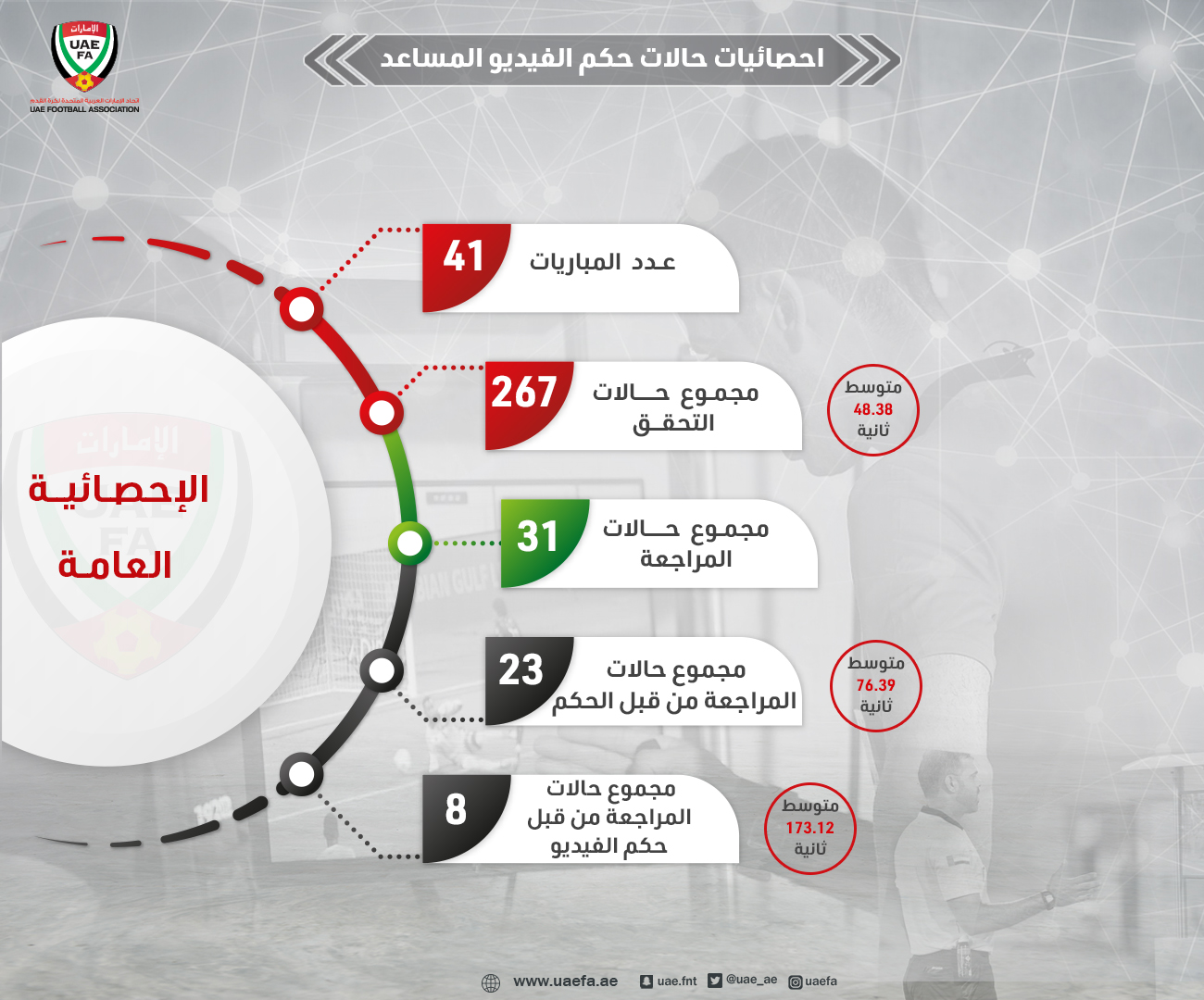 استخدمت تقنية حكم الفيديو المساعد "الفار" خلال 41 مباراة في الجولات الماضية من منافسات مسابقتي دوري وكأس الخليج العربي للموسم الرياضي الحالي. وذكر بيان صحافي من اتحاد الكرة أن عدد الحالات التي تم التحقق منها باستخدام تقنية حكم الفيديو المساعد 267 حالة تحكيمية، وبلغ الوقت المستغرق في التحقق من تلك الحالات 48.38 ثانية.