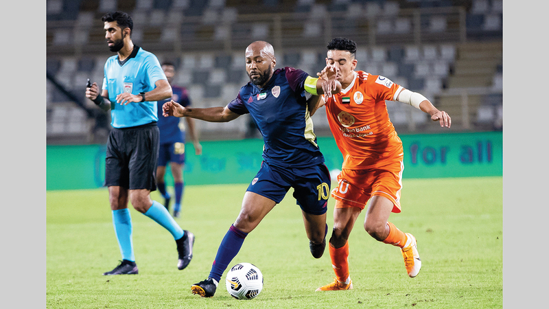 إسماعيل مطر يحاول المرور من لاعب عجمان عصام فايز. الإمارات اليوم