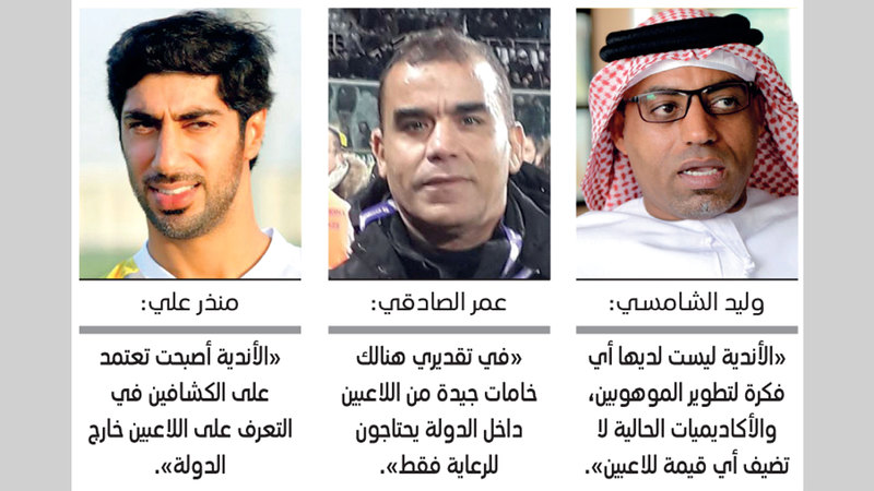 بدوره، أكد منذر علي، أن التقصير في التعرف على المواهب داخل الدولة سواء للمواطنين أو المقيمين لا يقع على عمل الكشافين، الذين تركوا هذا المجال وإنما على تخطيط الأندية بشكل أساسي، وأشار إلى أنه حينما يغيب التخطيط السليم فإن النتائج لا تخدم التوجهات الصحيحة.